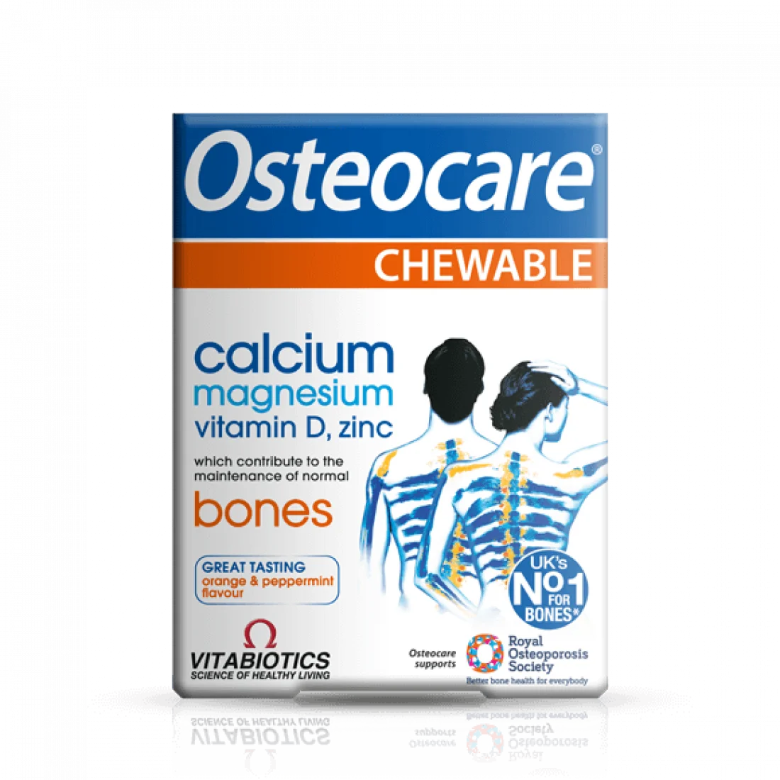 Osteocare Chewable gives you Calcium and co-factors like Vitamin D in great-tasting orange and peppermint chewable tablets.