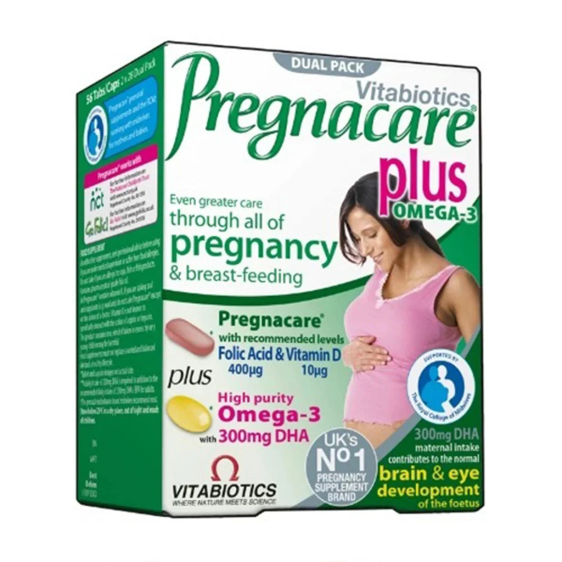 Provides all the benefits of the Pregnacare Original multivitamin tablet – which contains essential nutrients for pregnancy, plus an Omega-3 capsule to provide a rich source of DHA which contributes to normal brain and eye development of the foetus**.